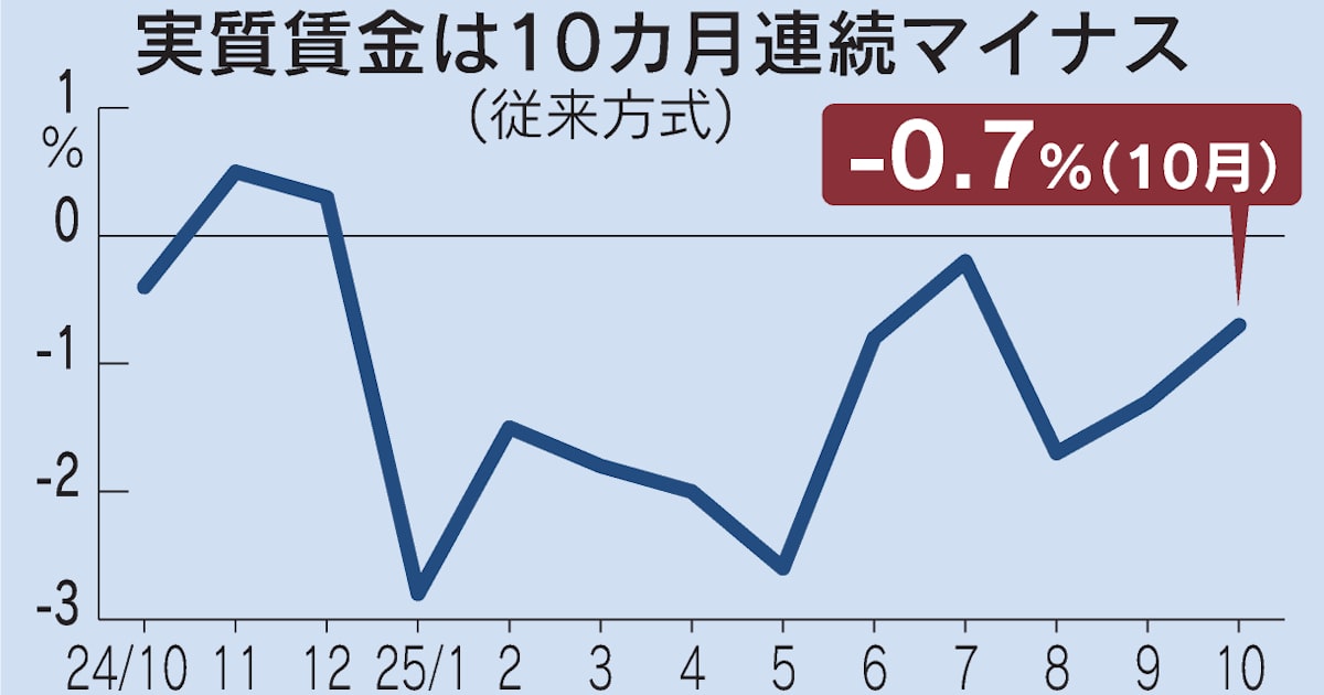 厚生労働省が8日発表した10月の毎月勤労統計調査(速報、従業員5人以上)によると、物価変動の影響を除いた実質賃金は前年同月比で0.7%減った。名目の賃金は伸びているものの物価上昇には届かず、25年1月以来10カ月連続のマイナスとなった。