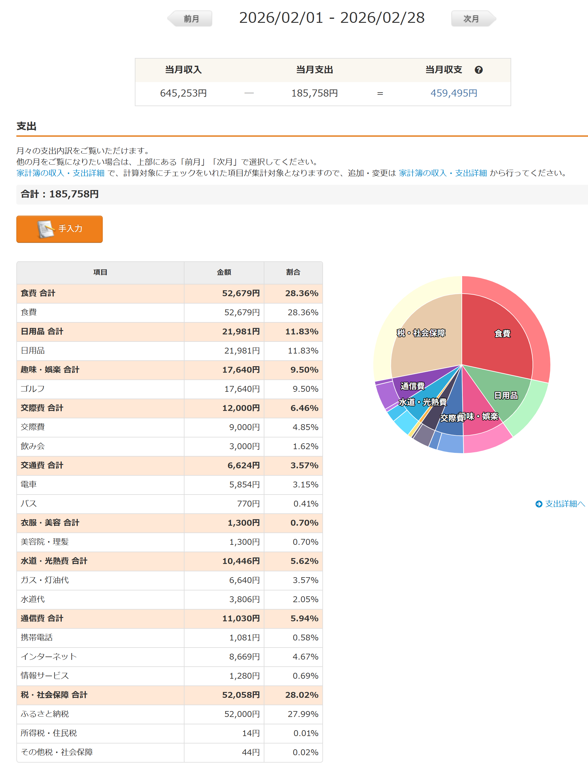 なんか、給与改定があってそれを遡りで支給するってイベントが有ったり、確定申告の還付金があったりで今年の2月は収入が多い月でした。支出もそこそこですね。