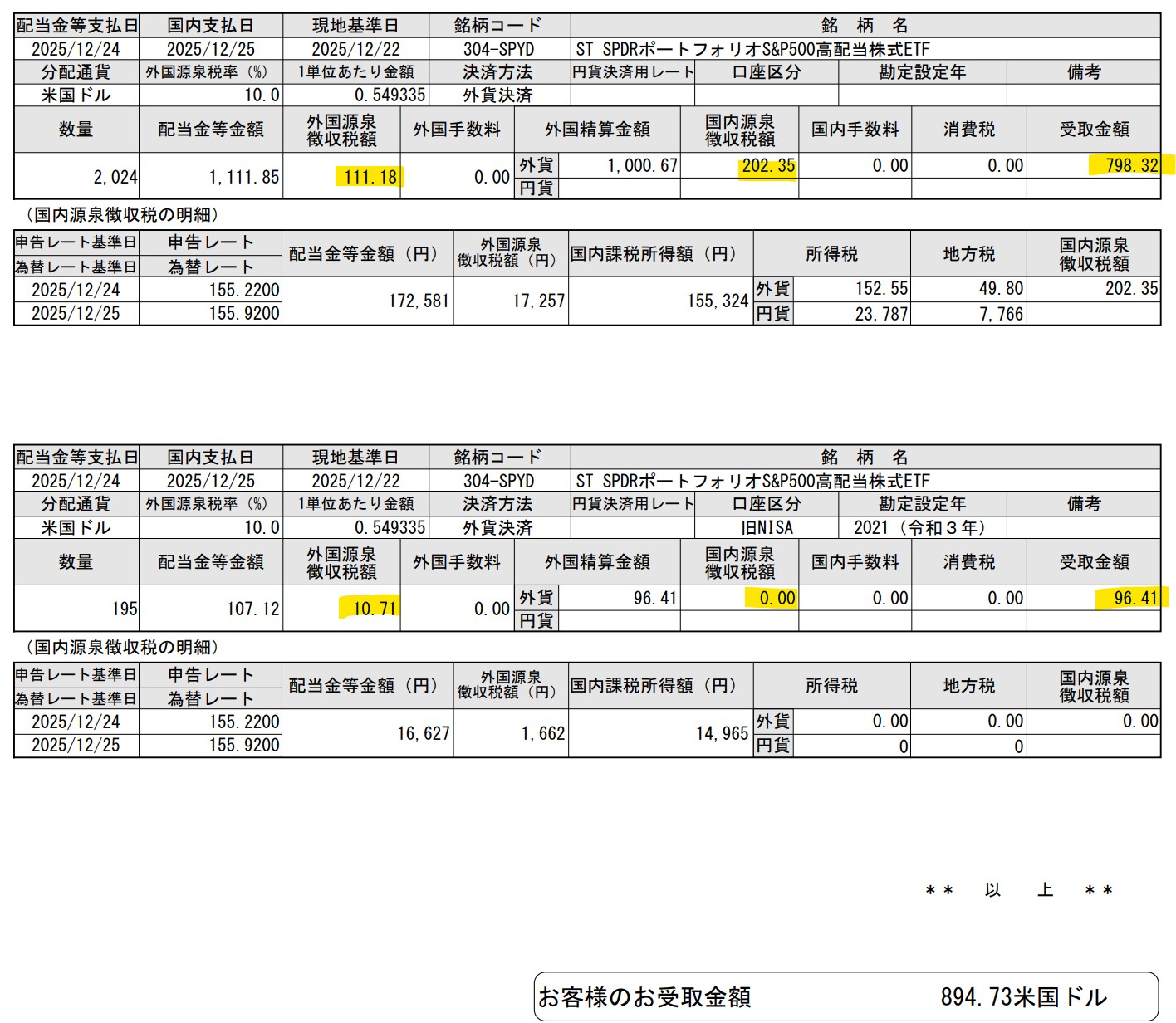 今回(202512期)のSPYDの税金を確認する!( ー`дー´)キリッ
